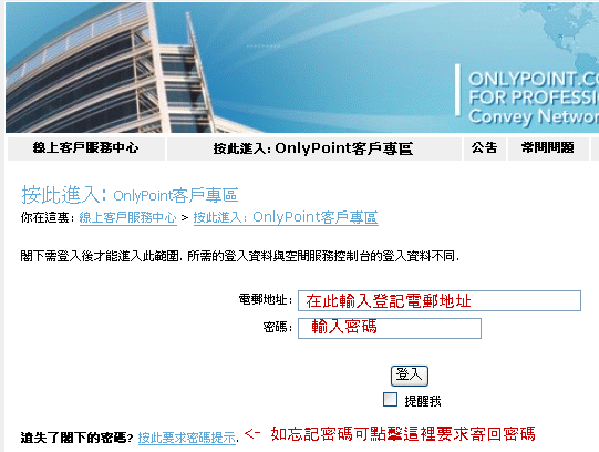 查詢服務到期日(網上客戶服務中心使用教學) : STEP 1 : 請點擊以下圖示進入 網上客戶服務中心 http://client.onlypoint.com STEP2 : 在網上客戶服務中心 http://client.onlypoint.com 中 登入OnlyPoint客戶專區